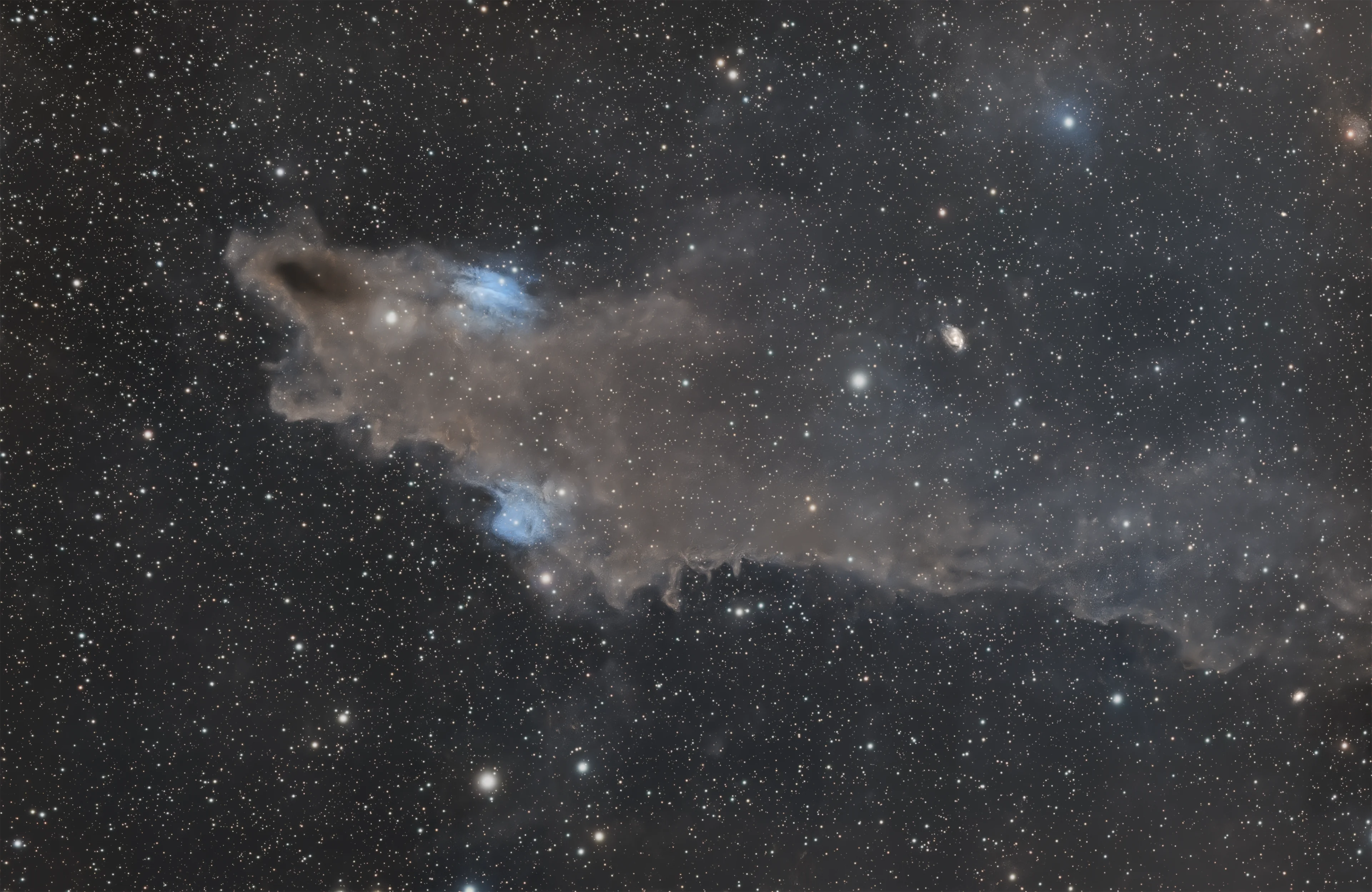 L’image met en évidence un vaste réseau de nuages de poussière interstellaire se détachant en silhouette sur un fond riche en étoiles faibles et en nébulosités diffuses. La forme caractéristique de LDN 1235 apparaît à travers de subtiles variations de densité de la poussière, tandis que les régions voisines en réflexion et en émission apportent profondeur et structure au champ.