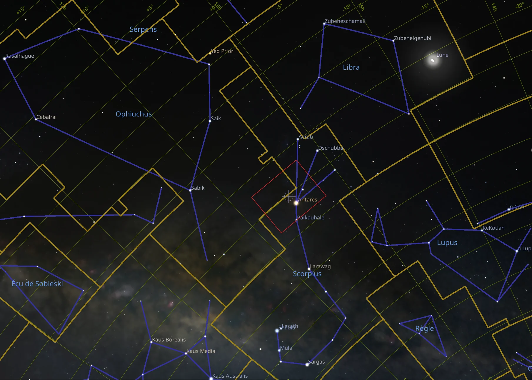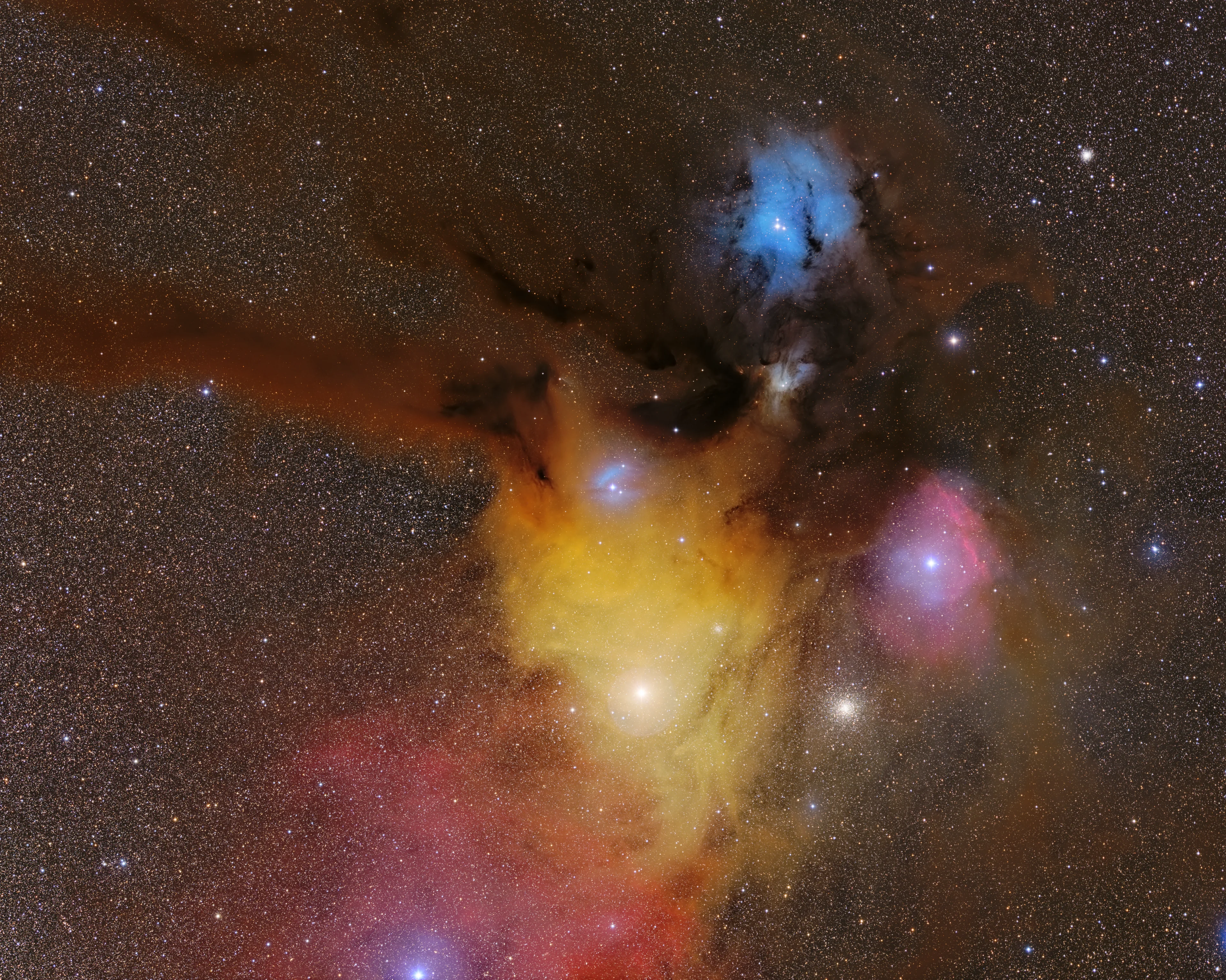 Grand champ du complexe de nuages de Rho Ophiuchi, un région de formation, à la frontière des constellations d’Ophiuchus et du Scorpion.